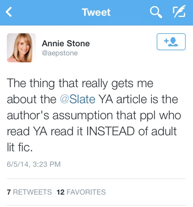 This corner of the Internet blew up the other day over an article written by a woman for Salon about why adults should be ashamed to read books written for the young adult age group. I enjoyed seeing some of the top YA writers on Twitter turn the criticism around by recommending their favorite YA instead (see #PromoteaYAInstead).